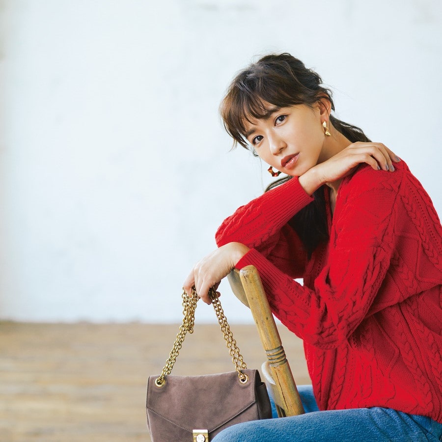お手頃価格で、気のきいた旬アイテムが揃うルクールブラン。特に、ほんのりと女らしさを備えたニットは、目の肥えたスタイリストやエディターたちも注目するアイテム。顔映え力抜群の、絶妙なVあきときれいな朱赤のケーブルニットを発見!