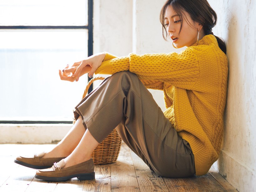 日本人の肌色を明るく見せる効果が高いと言われるマスタード色に近いイエロー。ゆったりシルエットのケーブルニットを選び、カジュアルに着こなして。