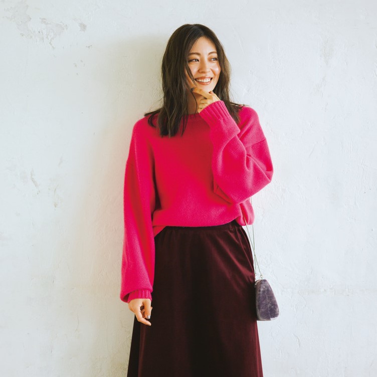 赤ニット初心者もトライしやすい深みのあるトーンも◎。