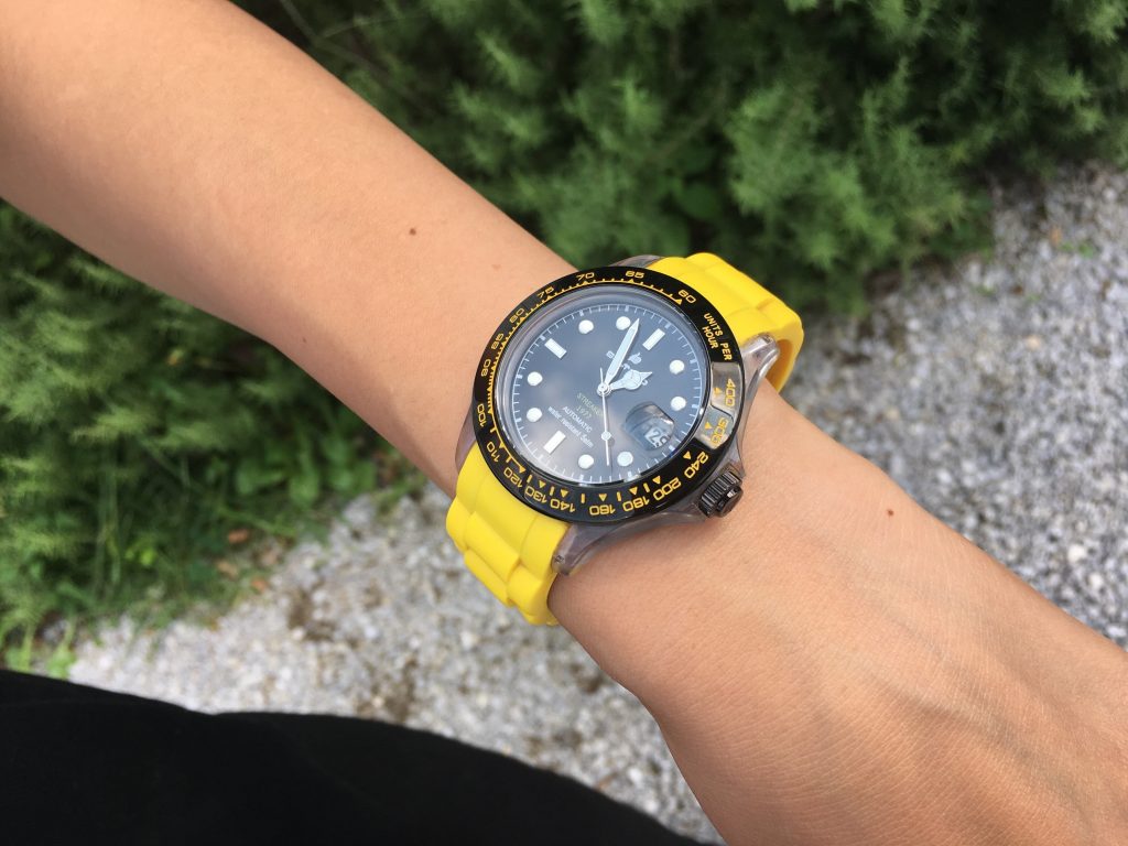 上下はシンプルにまとめて、腕にはイエローの時計。