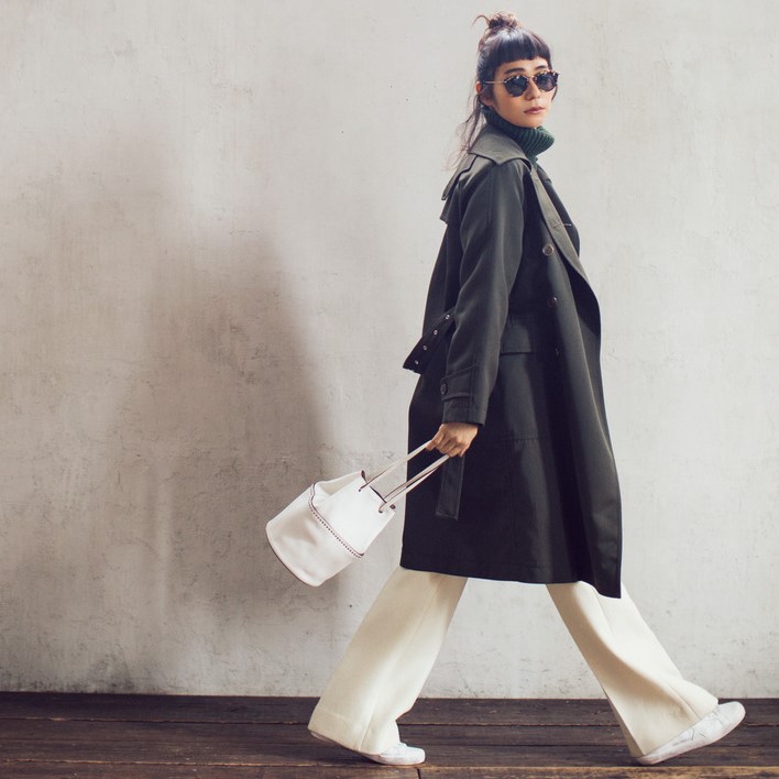 ニュアンスのある深いカーキに、肌寒い季節にまとうクリアな白が、ハッと視線を引きつけます。抜け感を演出する白スニーカーも一役買った、ひとつ上の大人のトレンチスタイルが完成。