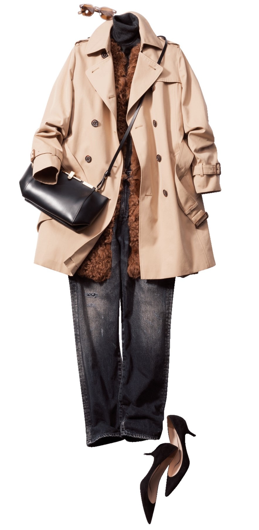 足元をファースリッパで遊ぶのもあり。トレンド感いっぱいのアクセント小物と合わせても品のよさをキープできるのが、トレンチの懐の深さ。