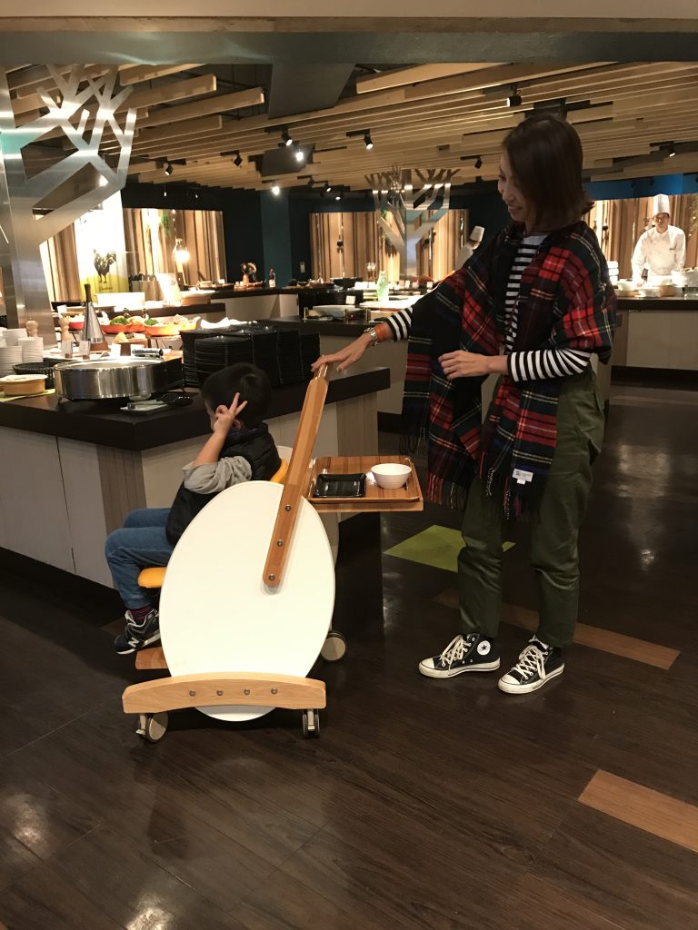 ビュッフェは好きなものを自由に取れるのが嬉しい半面、子供を抱っこしておぼんを持つのは大変だったりしませんか??そんなママに嬉しいサービスがこのレストランにのみ、置いてある”ままらくカート”の存在です。