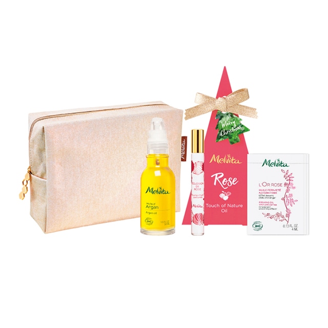 メルヴィータから、お手入れに使うと「仕上がりが変わる」と評判のアルガンオイルと、ローズの新作フレグランスオイルのコフレが登場。ゴールドにきらめくポーチやボディ用オイルもついてお得です!