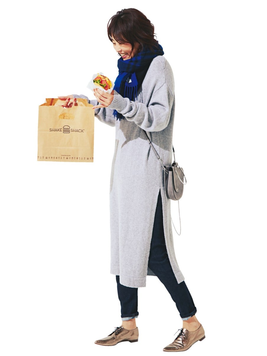 もたつきゼロのスキニーデニムなら、ニットワンピースをレイヤードしたトレンドのコーディネートにもトライできる。メタリック靴のインパクトが、コーディネートにメリハリを加えてくれます。