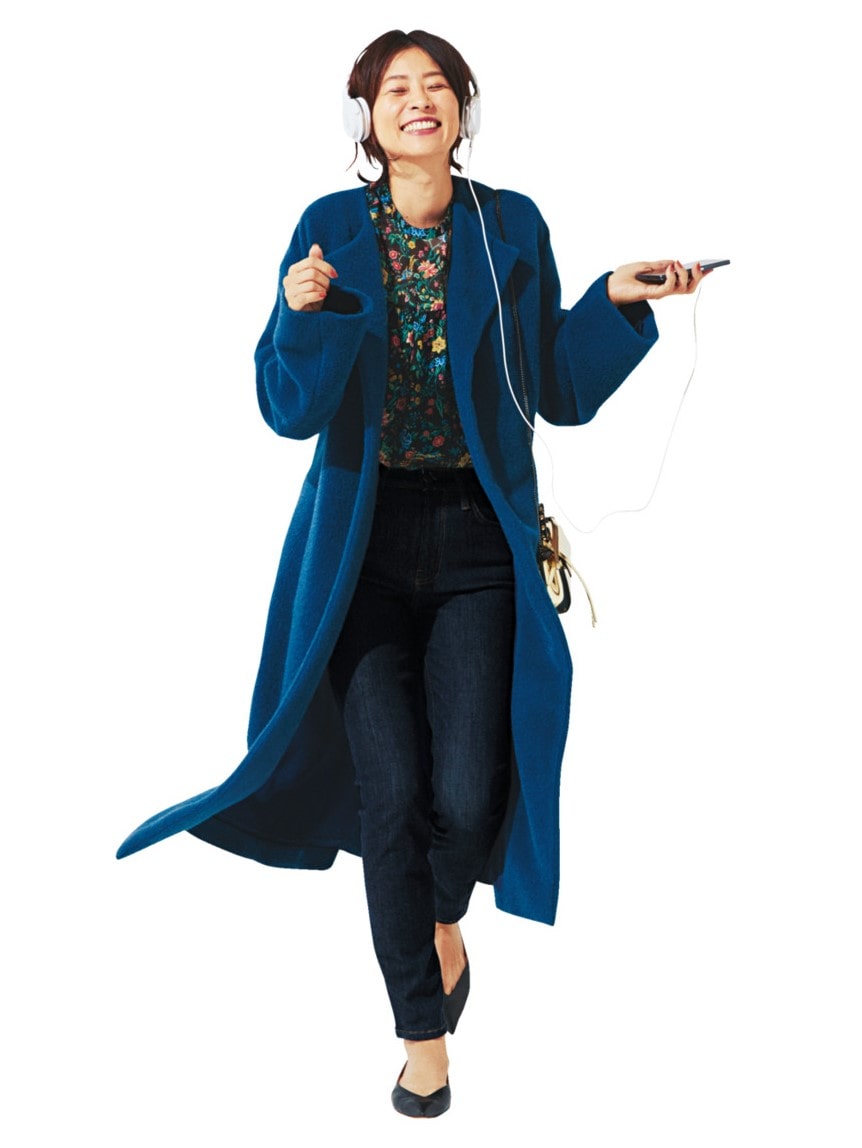 ロングコート初心者という人も、テクニックいらずでバランスよく着こなせるスキニーデニムと一緒なら、難なく取り入れられるはず。フラットパンプスのVラインが、まるでヒールパンプスを履いているかのような仕上がりを保証します。