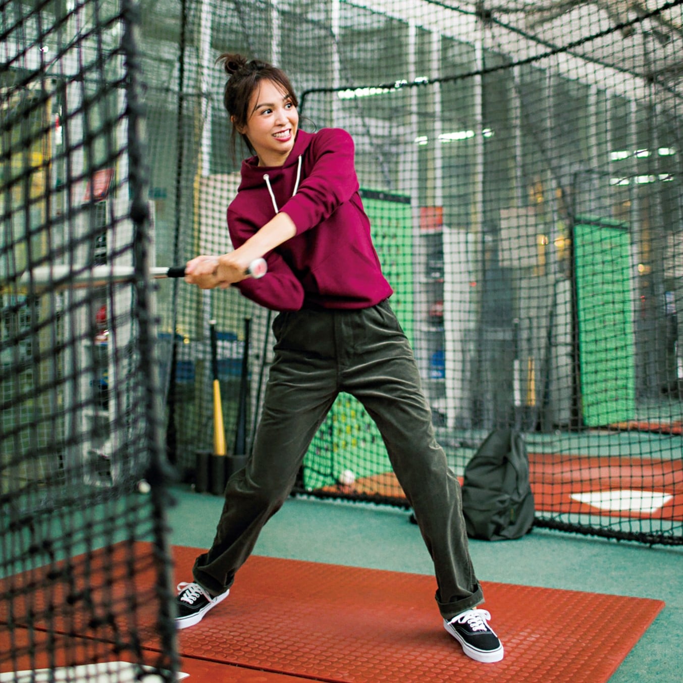 気温が思った以上に下がった早朝からの撮影後、スタッフみんなで体を温めにバッティングセンターへ。動きやすいスウェットパーカ×コーデュロイパンツのおかげで初のバッティングも大健闘! 帰宅したら、全身、丸洗いしちゃいましょ。