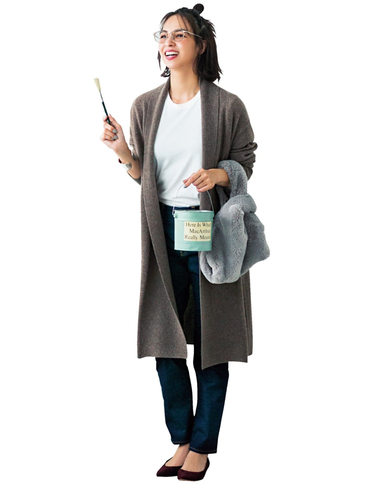 白T×デニムのシンプルコンビにカシミヤカーデをさっとはおり、汚れる前提のアート教室へ