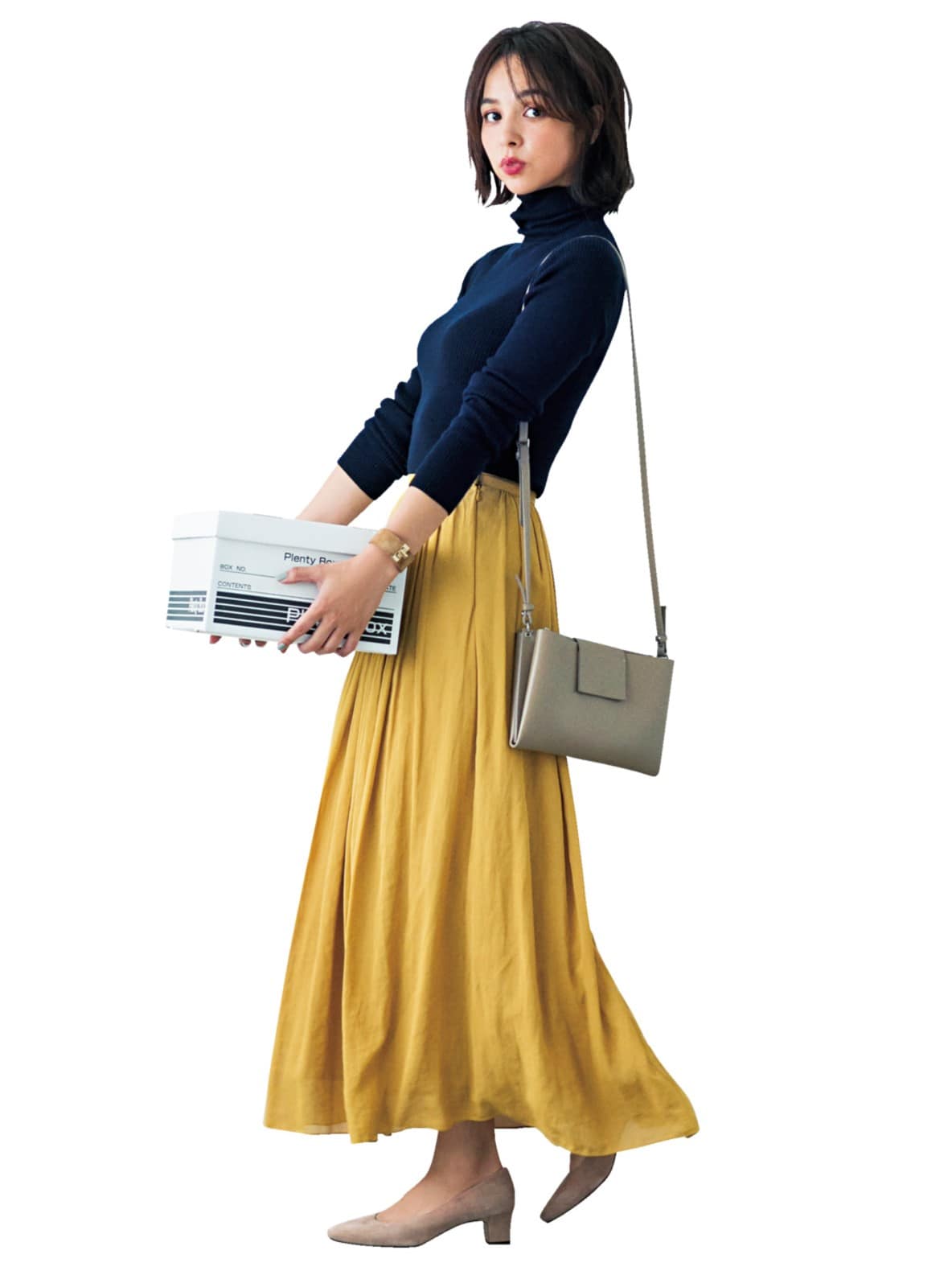 忙しい中、慌ててコーヒーをテイクアウトすると、決まって汚してしまう私……。でも、洗えるニット×パンツのコンビなら落ち込みも半減! 美シルエットのニットとハイウエストの美脚パンツが、ローヒール靴のコーディネートを着やせへと導いて。