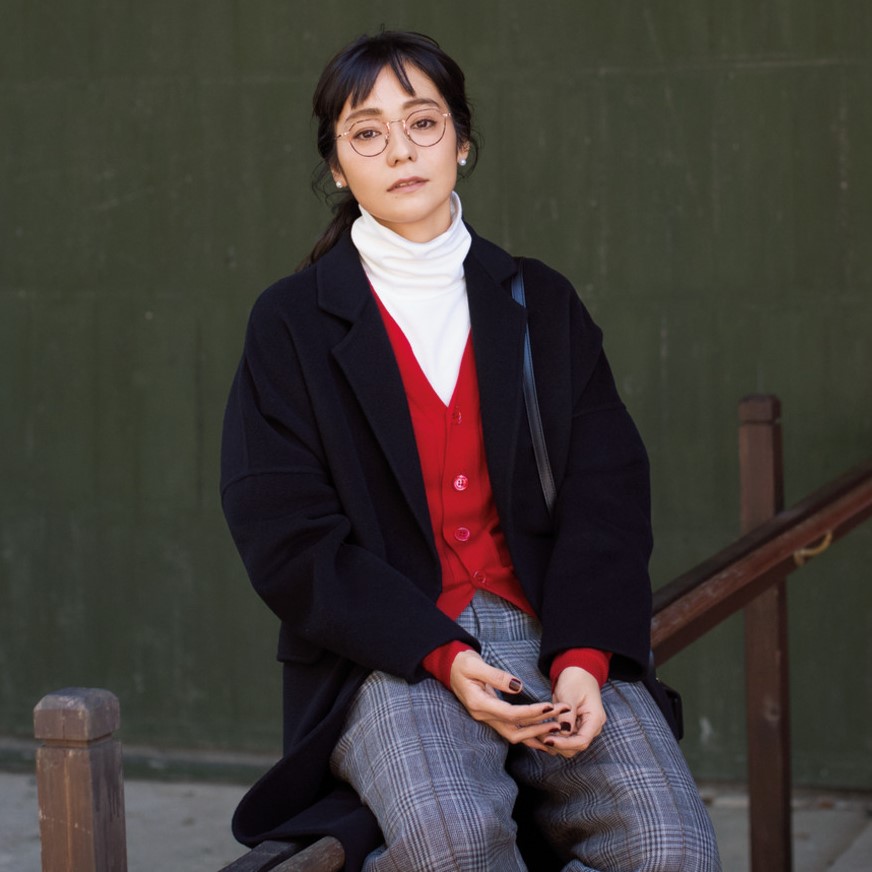 カーディガン¥24000/八木通商(ルトロワ) コート¥68000/ミューズドゥ ドゥーズィエム クラス 表参道店 カットソー¥7000/バロックジャパンリミテッド(ブラックバイマウジー) パンツ¥38000/オーラリー メガネ¥33000/コンティニュエ(イエローズ プラス) ピアス¥15000/カドー バッグ¥34000/エーピー ストゥディオ ニュウマン シンジュク(アベニュー)