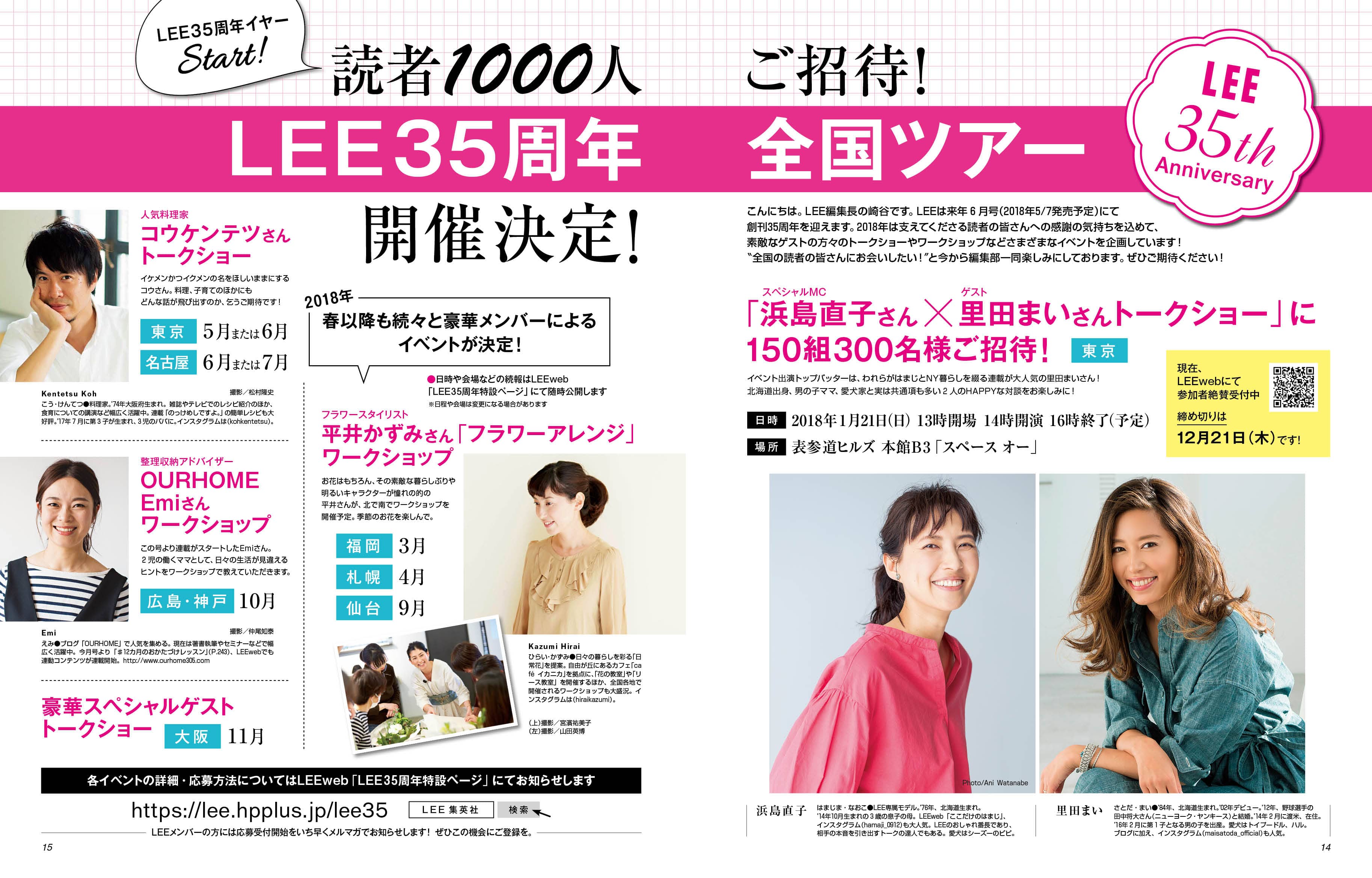 LEEは来年5月、創刊35周年を迎えます。2018年は読者の皆様への感謝の気持ちを込めて、全国で様々なイベントを企画していきます。第1弾は来年1月、はまじと里田まいさんのトークショー。参加者絶賛募集中です。全国の読者の皆さんにお会いしたい!と編集部一同楽しみにしております。LEE webからご応募できます。ぜひご期待ください。
