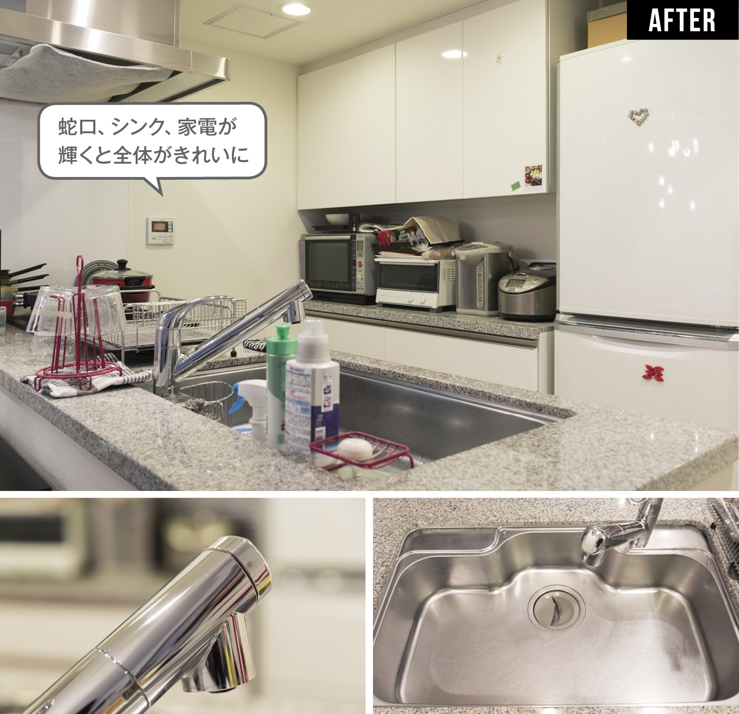 「使いやすく整っていますが、キッチンの印象を左右する蛇口が曇っていて、シンクは水滴跡が目につきます。ここを磨き上げればかなりきれいに見えますよ」(高橋さん)