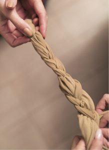 ストッキングを半分に折り、折った部分を結んで3本(両足+履き口)に。伸縮性があるほうが磨きやすいため、ゆるめに編んでいきます。最後まで編んだら結んで完成。