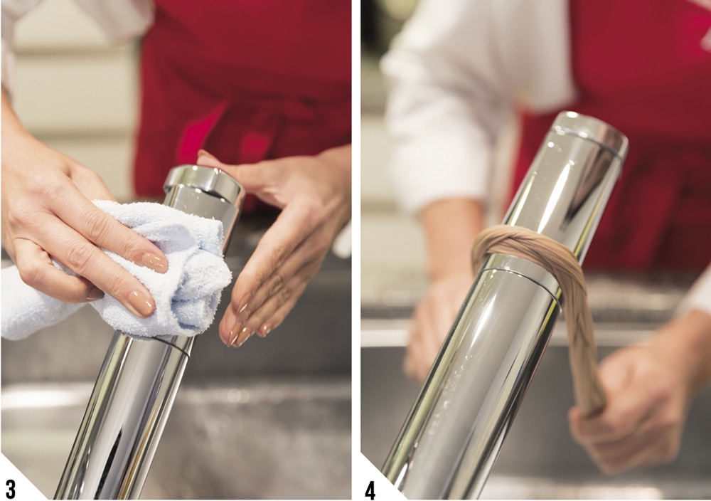 (1)蛇口と同様に食器用洗剤をつけた台ふきんでふき(汚れている場合はスポンジで)、水で流します。(2)仕上げに乾いたふきんでふき上げると美しく、水アカ防止にも。