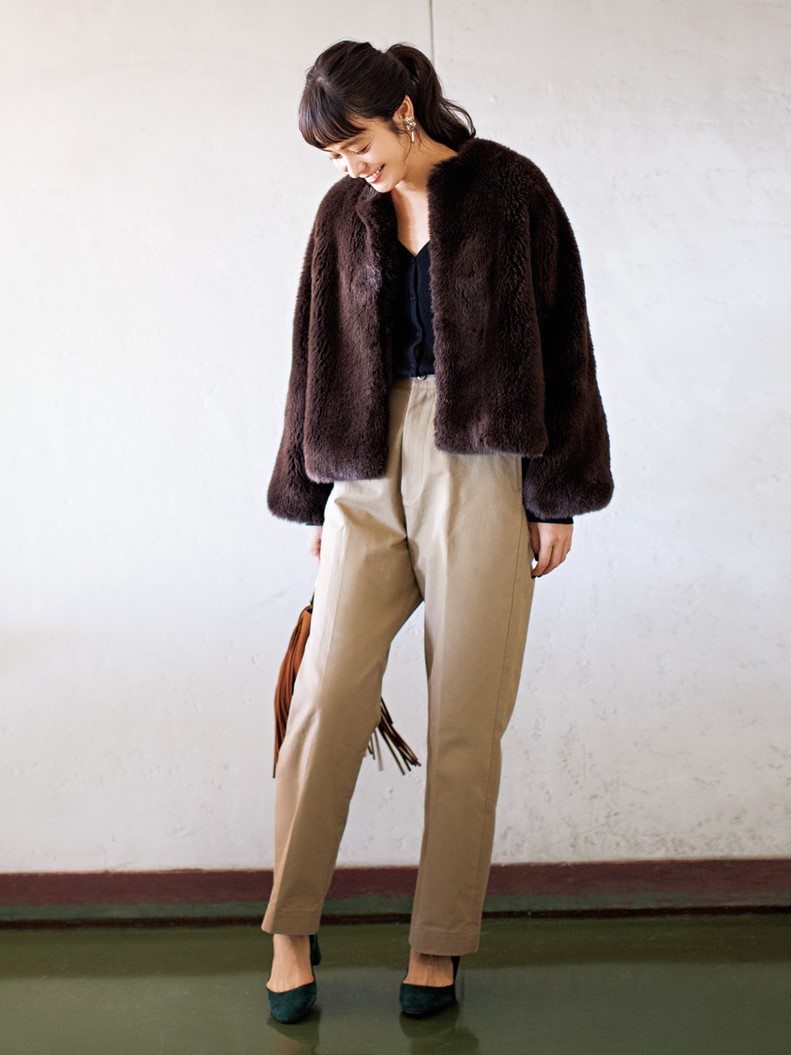 モコモコした毛足の長いファーを、ニット感覚で着たVカーデの鎖骨見せで女らしくさらりとこなして。大人気のハイウエストチノ&ヒールパンプスですらっとスタイル美人にも。