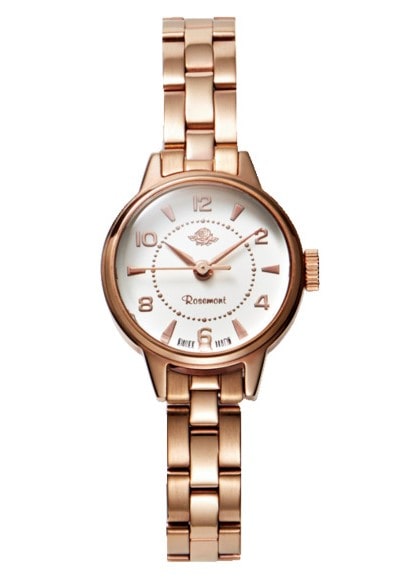 華やかな丸フェイスのブレスレットウォッチはアクセサリー感覚で使え、淡いピンクのニットやパールネックレスと相性抜群。温かみのあるローズゴールドは、肌をブライトアップしてきれいに見せてくれる効果も。