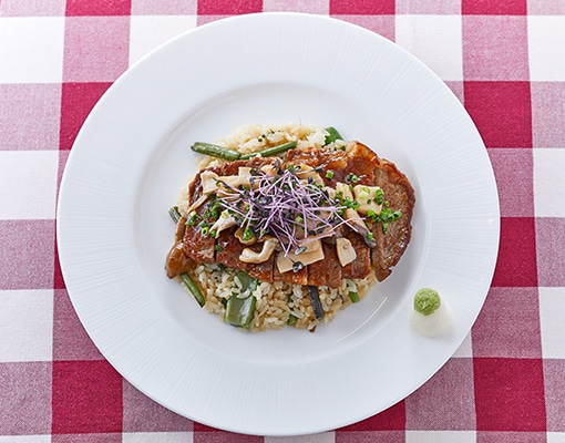 ◆肉料理:和風リブアイステーキと山菜ピラフ 飛騨山椒の香り