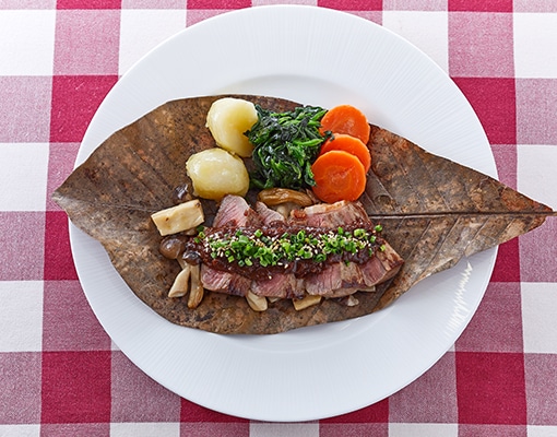 試食させていただいた松本シェフのメニュー、香ばしい牛肉と、肉の旨味が溶け込んだ朴葉味噌のコラボレーションが絶妙! 朴葉味噌はそのままご飯にのせて食べたいほどの逸品でした。