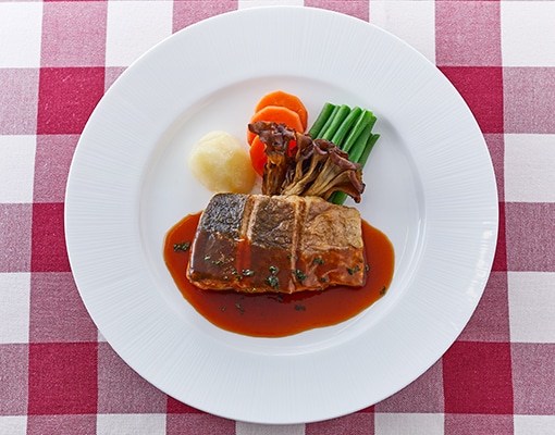 ◆魚料理:千曲川サーモンのポワレ ラタトゥイユ添え 白ワイン風味のソース