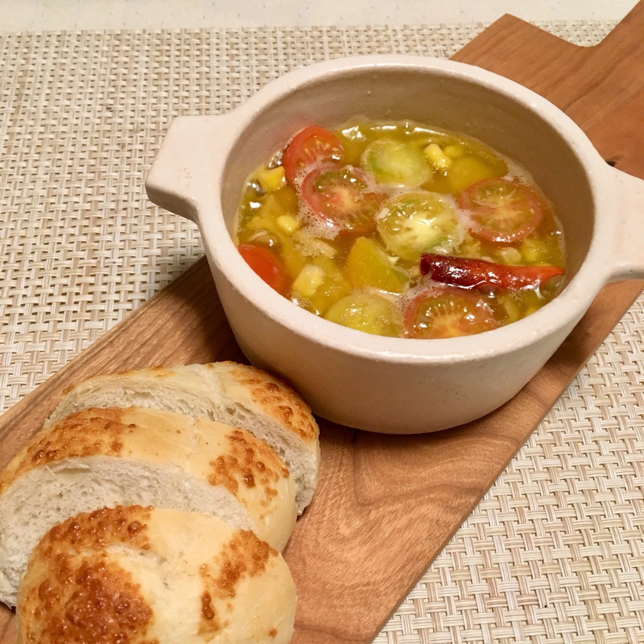 すぐに用意できるミニトマトや缶詰のコーンも加えて。「アレンジもラクちんでした!」