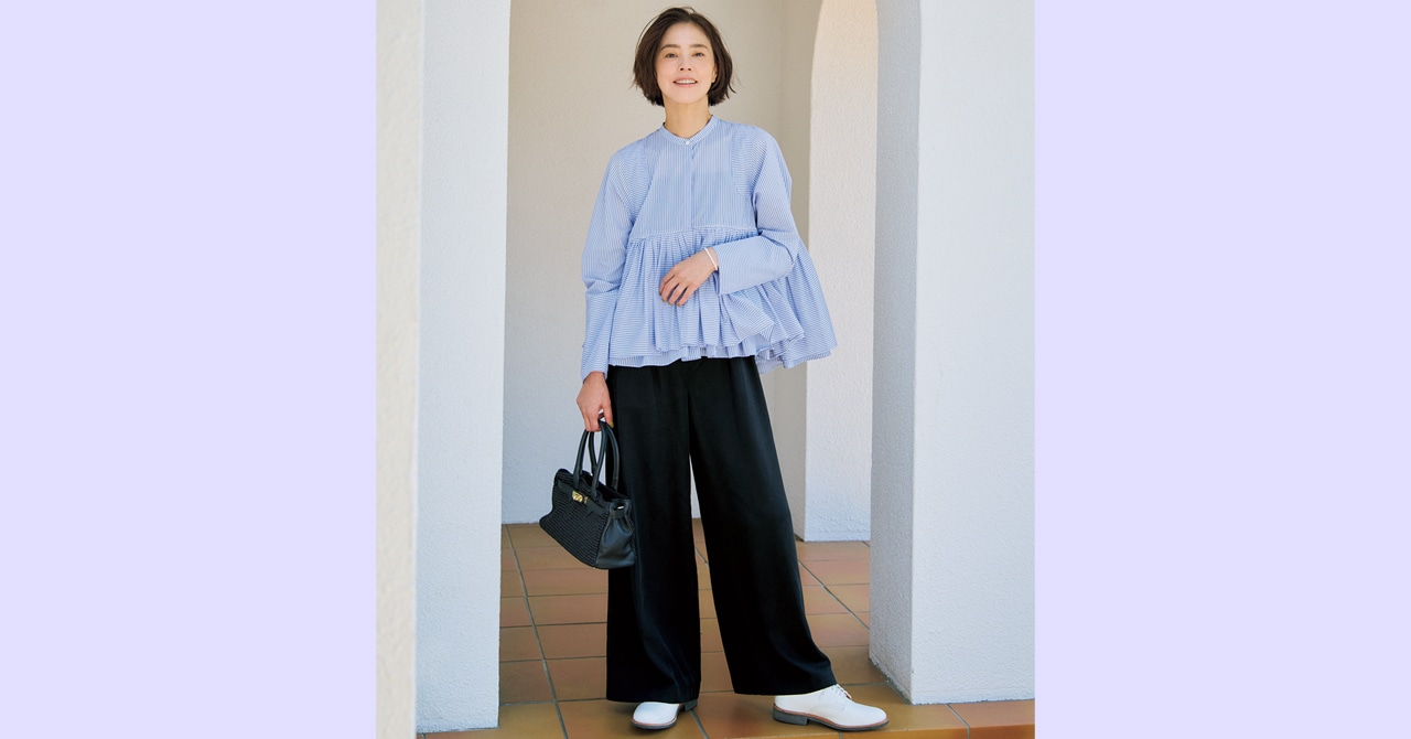 甘ブラウスにエレガントな印象のブラックパンツをあわせて、ぐっと大人らしく!/明日なに着る?