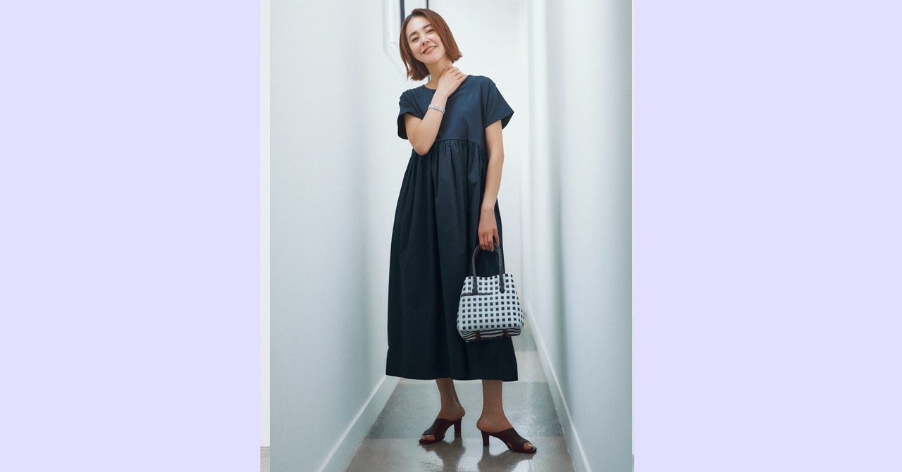 夏の日差しに映えるつややかなネイビーワンピで品よくリラクシーに/明日なに着る?