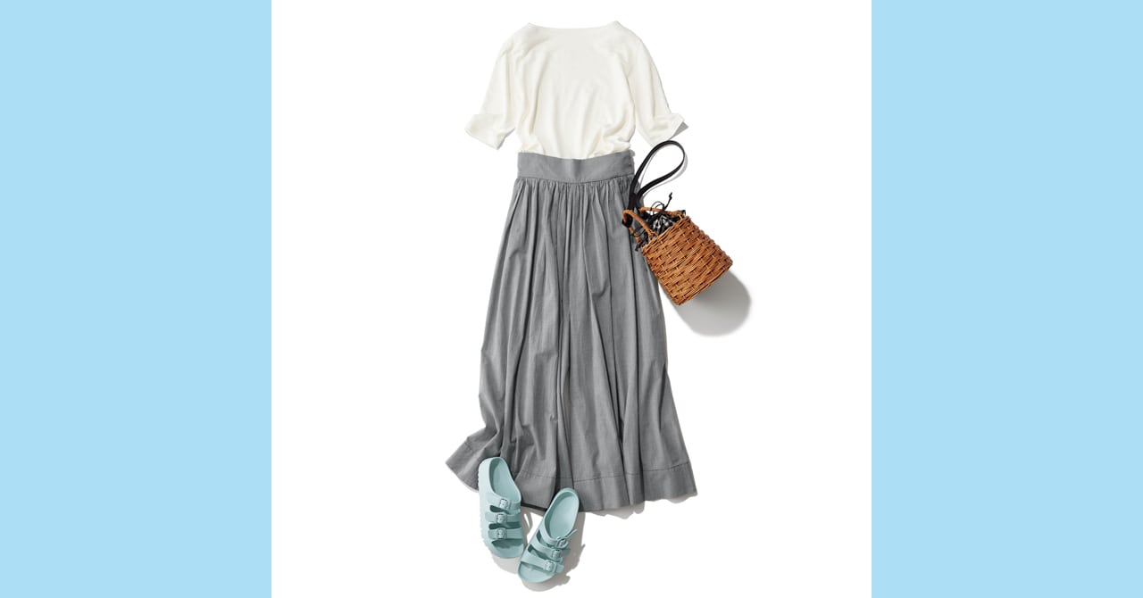 スカート見えパンツのウエストマークが着こなしのキモ。ブルーグリーンのサンダルで涼感をひとさじ/明日なに着る?