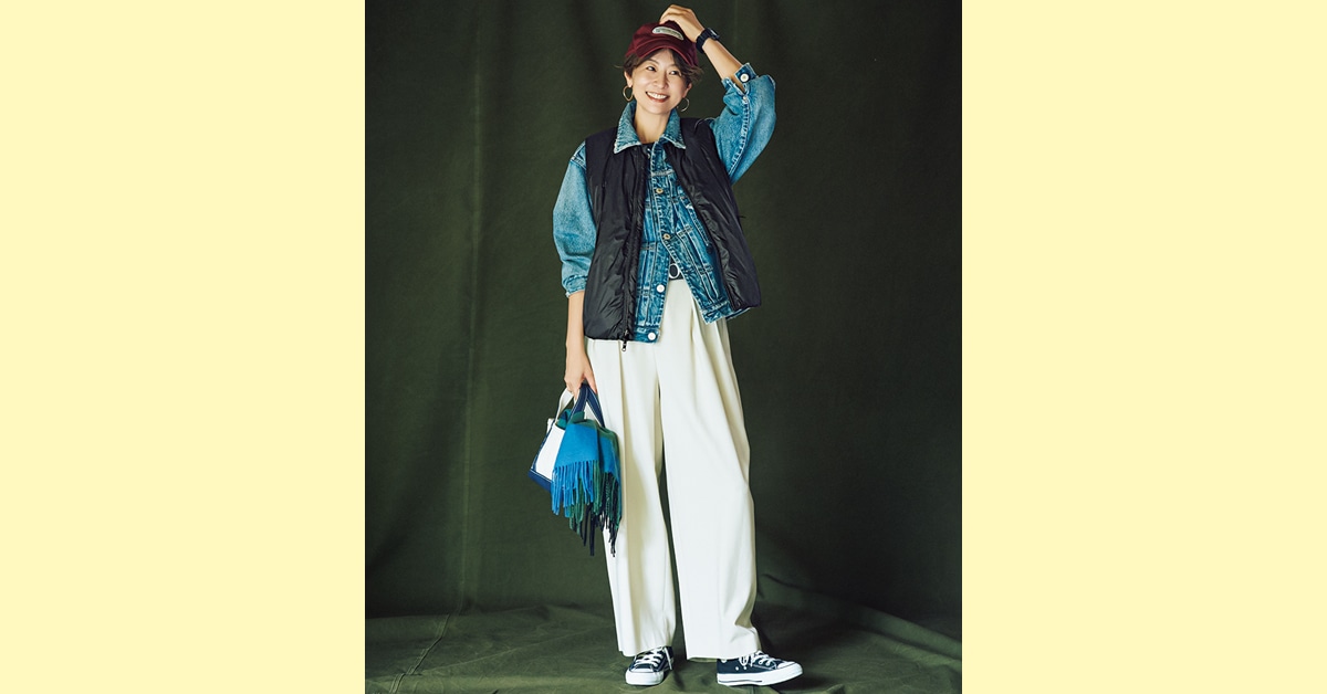 柔らかなダウンベスト+Gジャンの重ね着を、明るいベージュのパンツで軽やかに/明日なに着る?
