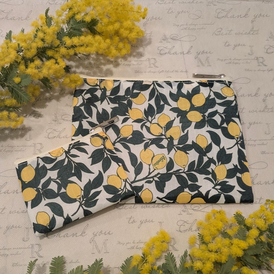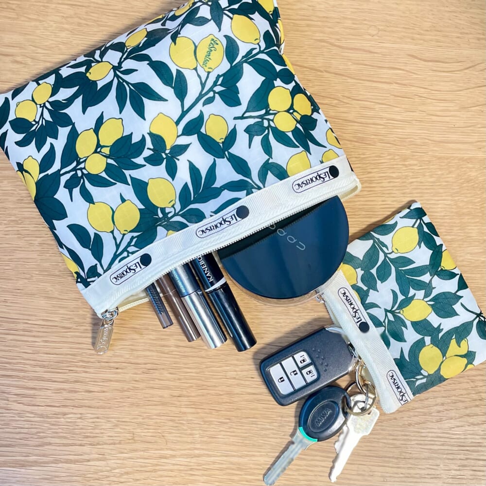 レスポートサックのレモン柄ポーチ、早速メイクポーチとキーケースに。【LEE4月号特別付録】