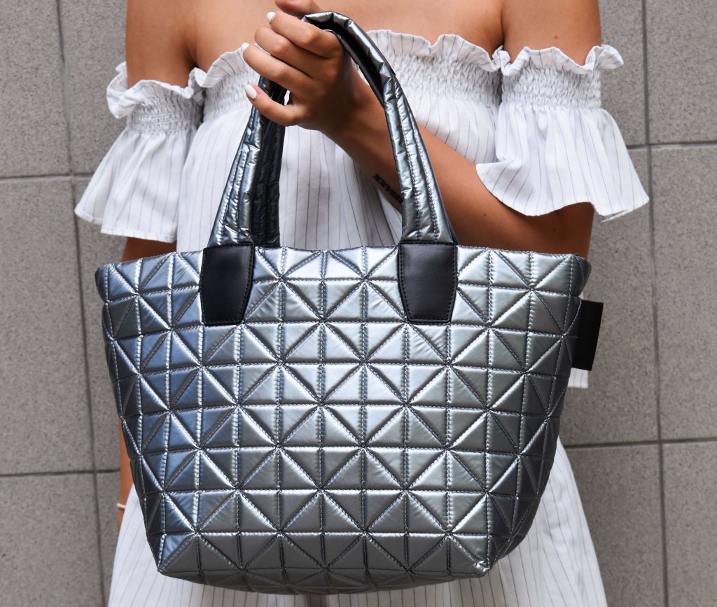三角形のキルティング模様が印象的なトートバッグは、軽くて耐久性と撥水性のある素材感も申し分なし。「もう重いバッグは持てないわ」という人にうってつけです!!