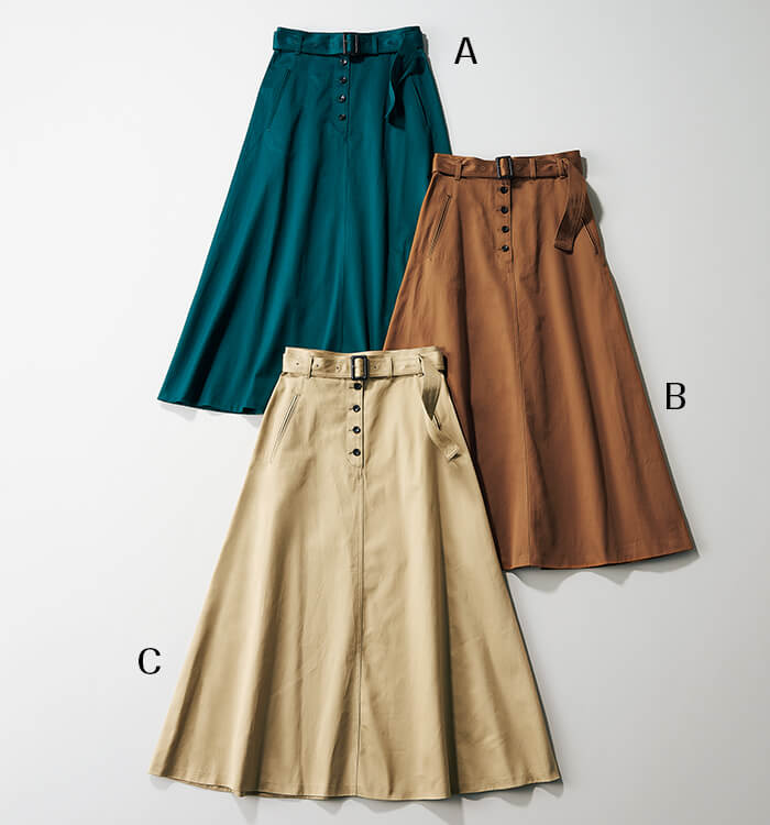 トレンチコート風のデザインがきいた、着こなしの鮮度をUPするスカートをお届けします。
