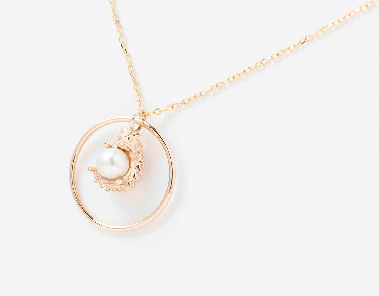 ブランドキャラクターのハリネズミが淡水パールを抱いている、愛らしいデザインのネックレスです。