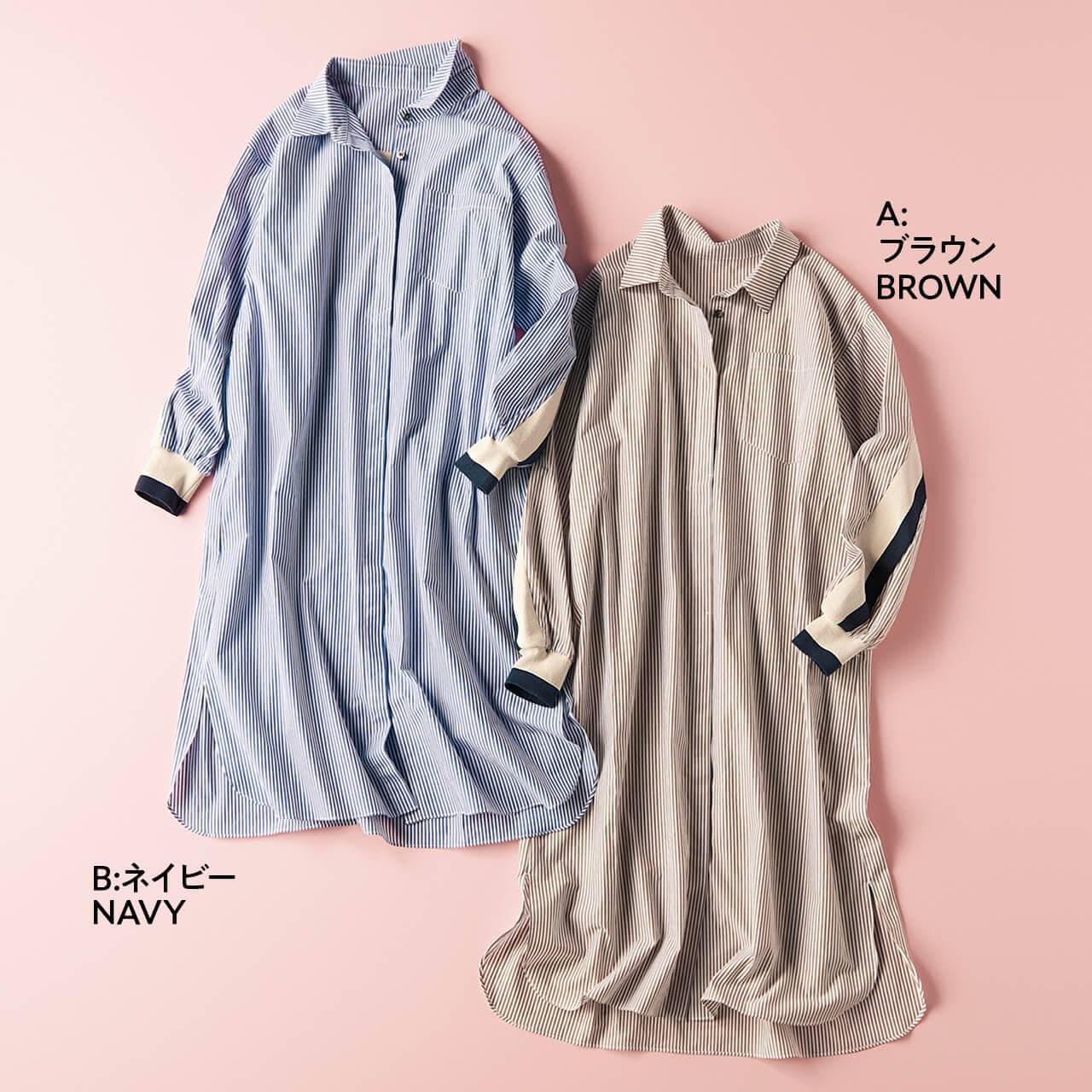 なめらかな風合いのコットン100%のストライプ生地に、背中から袖にかけてグレー×ネイビーのストレッチリブを配した、個性が光るシャツワンピース。ゆとりを持たせた首まわりと小さめの衿で、抜け感たっぷりに着られ、これからの季節に心地よい一枚です。パンツとのレイヤードも決まりやすいひざ下丈。
