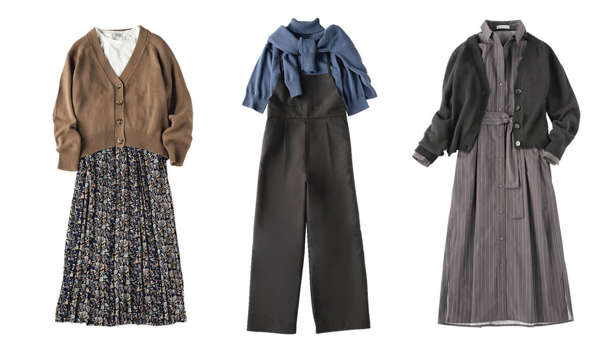 ニットカーディガン〈ベージュ〉¥5500・クルーネックカットソー〈オフホワイト〉¥3900・プリーツロングスカート〈アラベスク〉¥5900/アフタヌーンティー・リビング(アフタヌーンティーワードローブ)