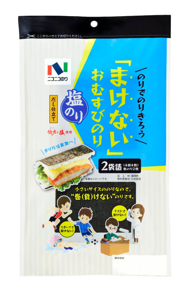“のりでのりきろう!”をキャッチフレーズに、塩味と出汁のきいた 4 切タイプのおむすび用味付け海苔。