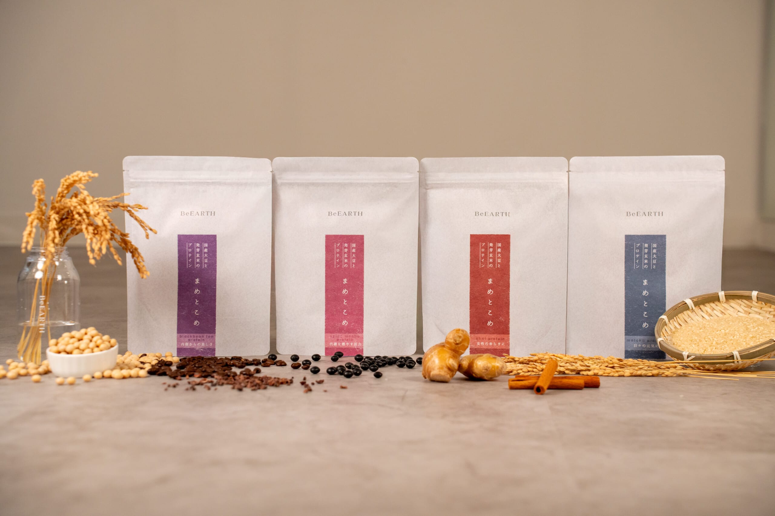 そんな「BeEARTH」が多忙な日常をおくる女性のために開発したのが、国産大豆と発芽玄米のプロテイン「まめとこめ」。体を”つくる”、”鍛える”ための栄養補助食品として知られるプロテインを、体を”整える”ものとして再解釈しました。