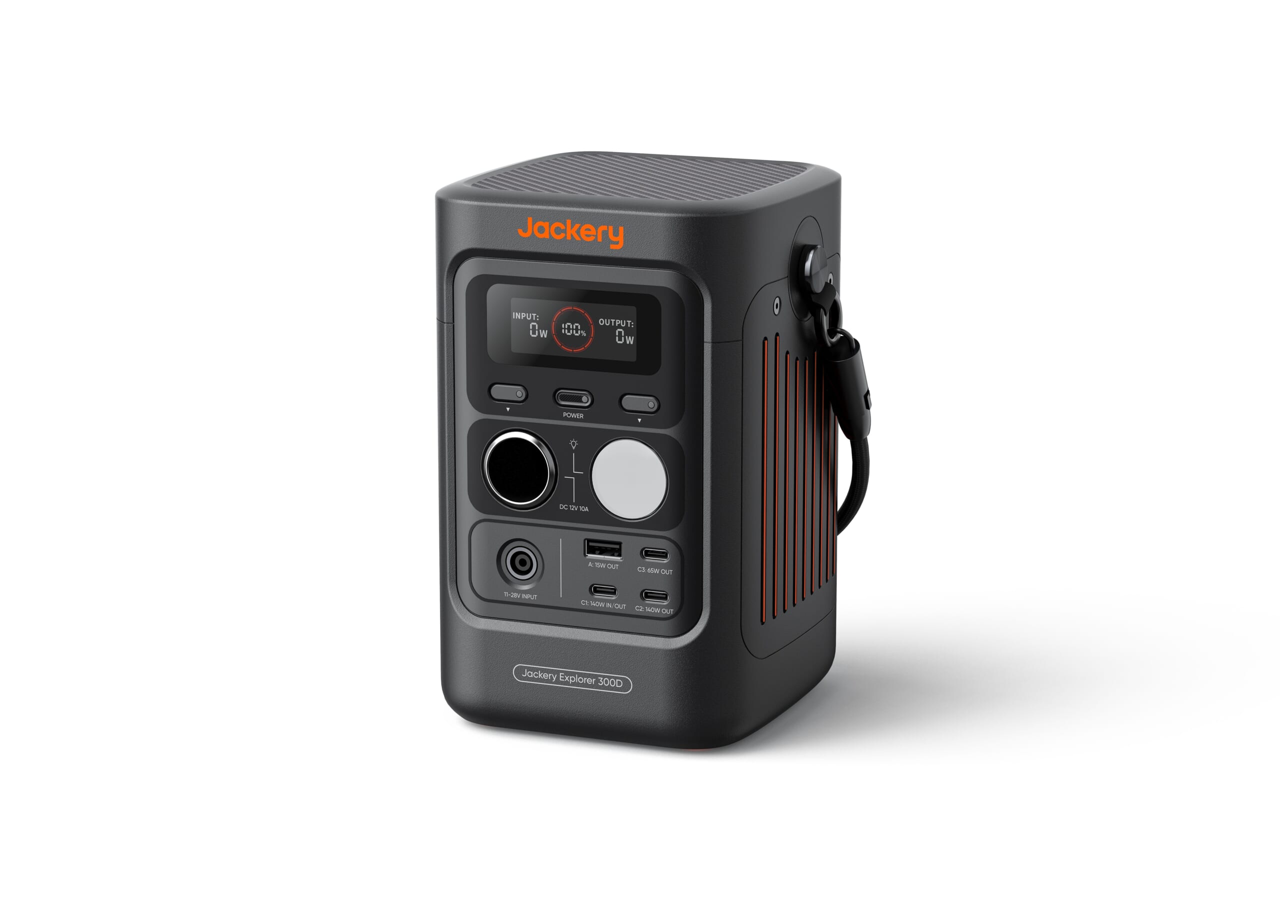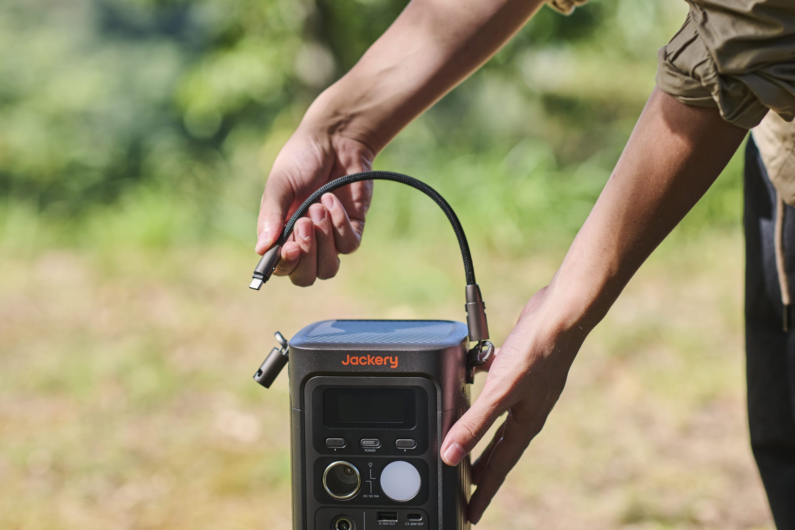 「Jackery ポータブル電源 300D」は、少し縦長な”箱”型。重さはわずか2.5㎏、高さは500mlペットボトルと同じくらいでコンパクトな設計です。ハンドストラップと肩掛けストラップの2種類つきで、用途に合わせて持ち方を変えられる仕様。短いほうのハンドストラップは、そのままUSB充電ケーブル(出力140W)として使用可能なのもうれしいポイント。