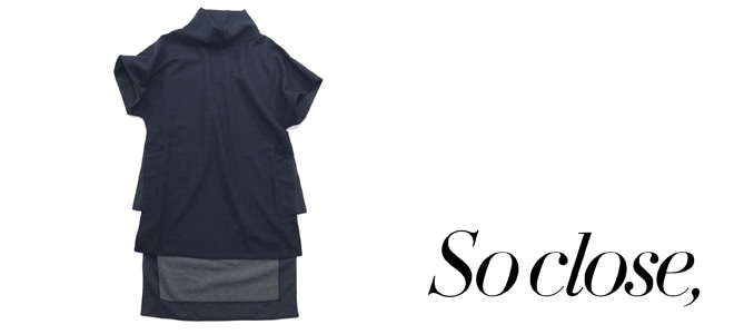 表と裏の色が違うダブルフェイスだから、動くたびに両脇のスリットから裏の配色がのぞいてアクセントに。袖は身頃続きで襟もリラックスしたムードがただようオフタートル。両脇のマチに配したグログランもさりげないけれど、確実に着こなしに奥行きを与えてくれます。