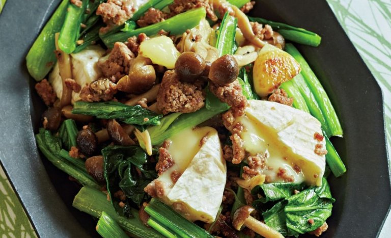 「ひき肉、小松菜、しめじ+カマンベールチーズ炒め」レシピ/堤 人美さん