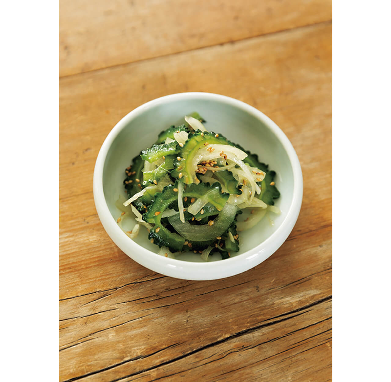 - ゴーヤーはワタと種を取り、薄切りにしてボウルに入れ、塩をもみ込んで5分ほどおいて絞る。