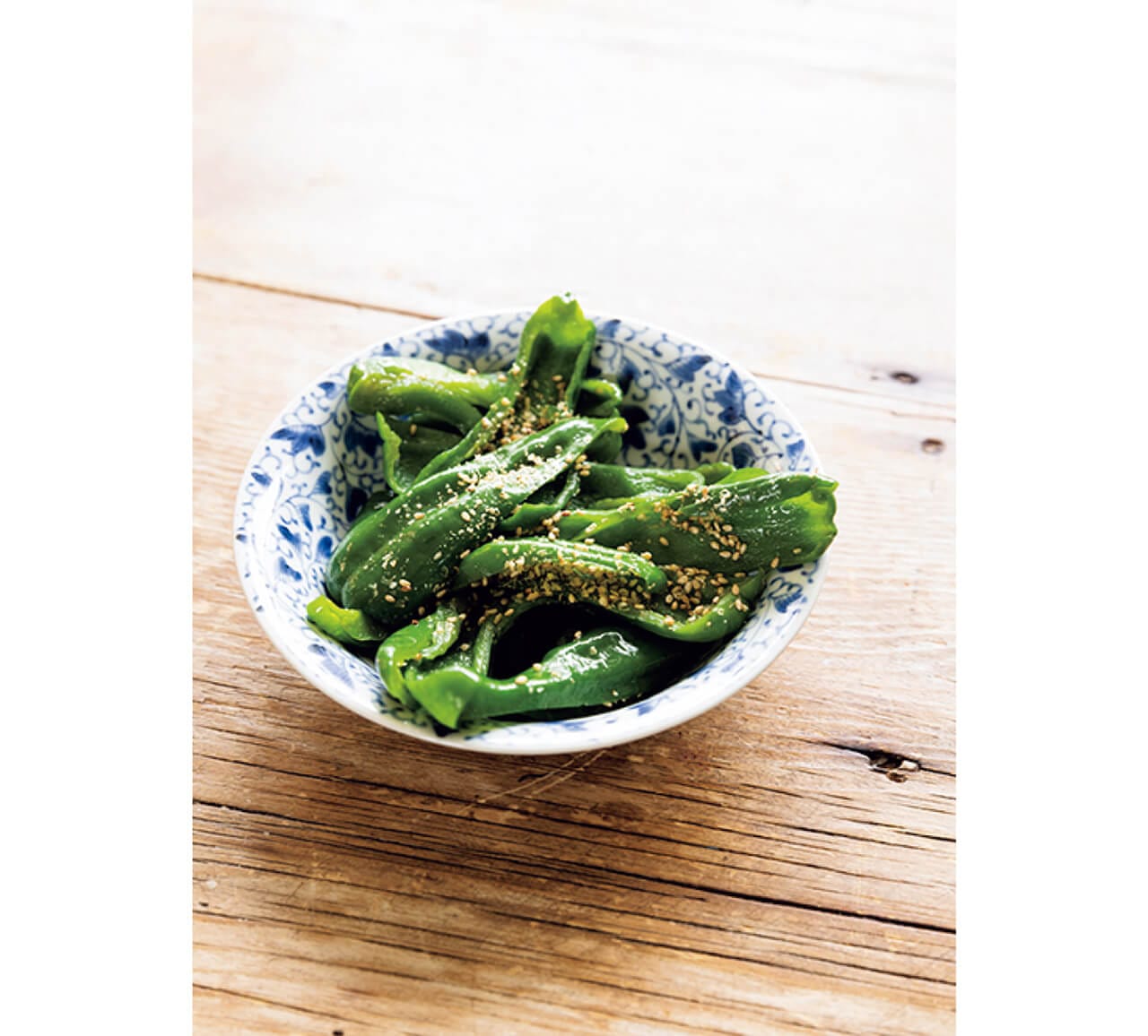 - ピーマンは縦半分に切ってヘタと種を取り、さらに半分に切る。