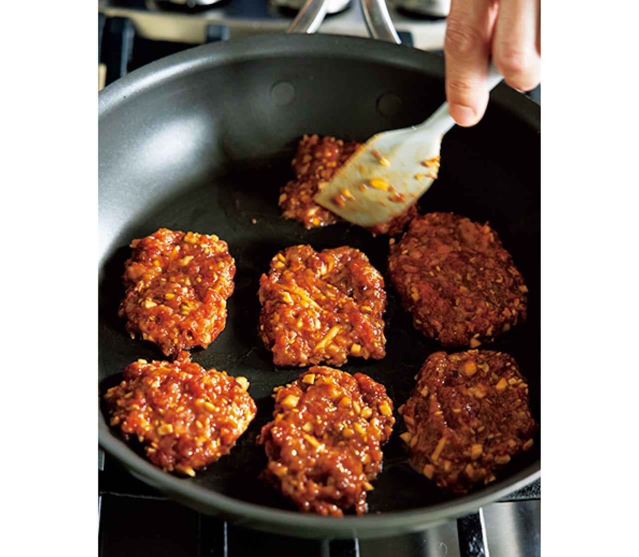 - 牛肉は包丁で粗く叩く。しいたけはみじん切りにする。
