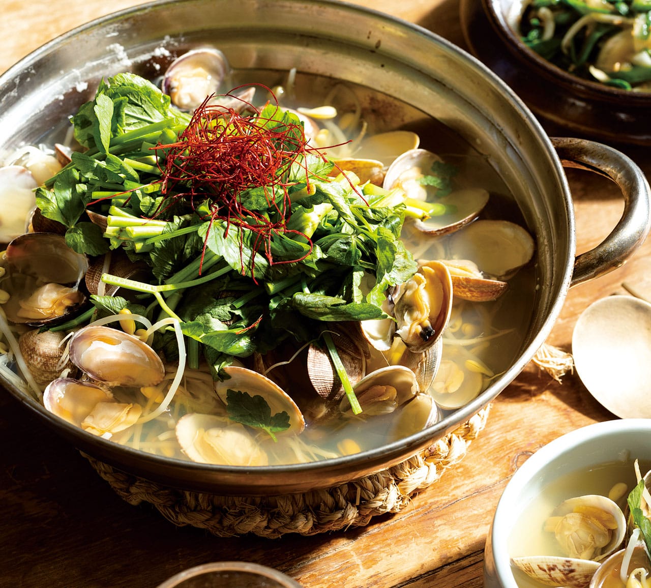 - せりをのせて、フタをして1分ほど蒸し煮にする。味をみて塩で味を調えて、糸唐辛子をのせる。