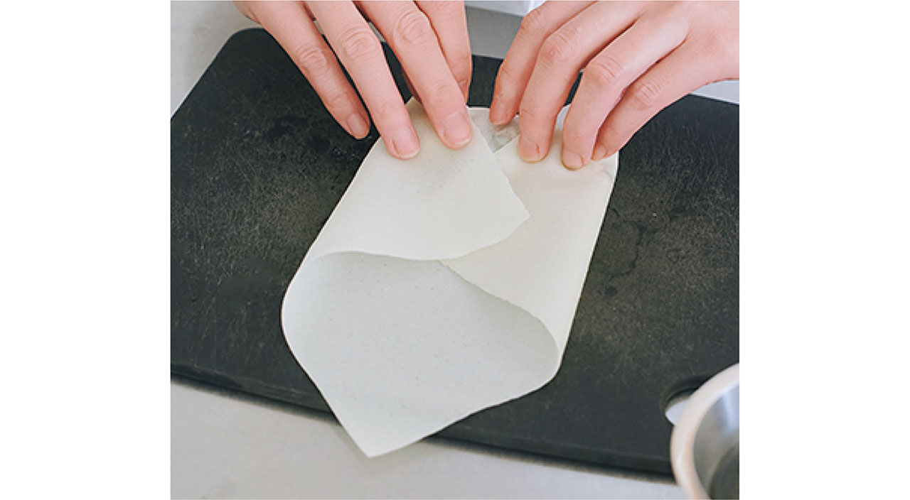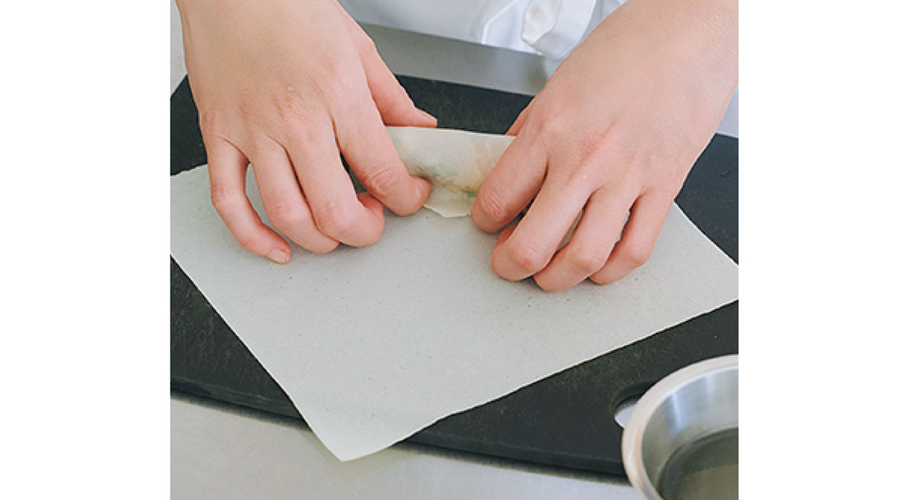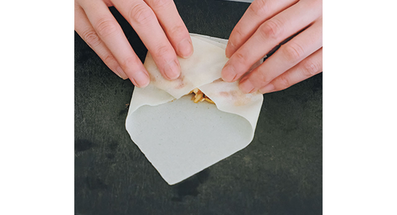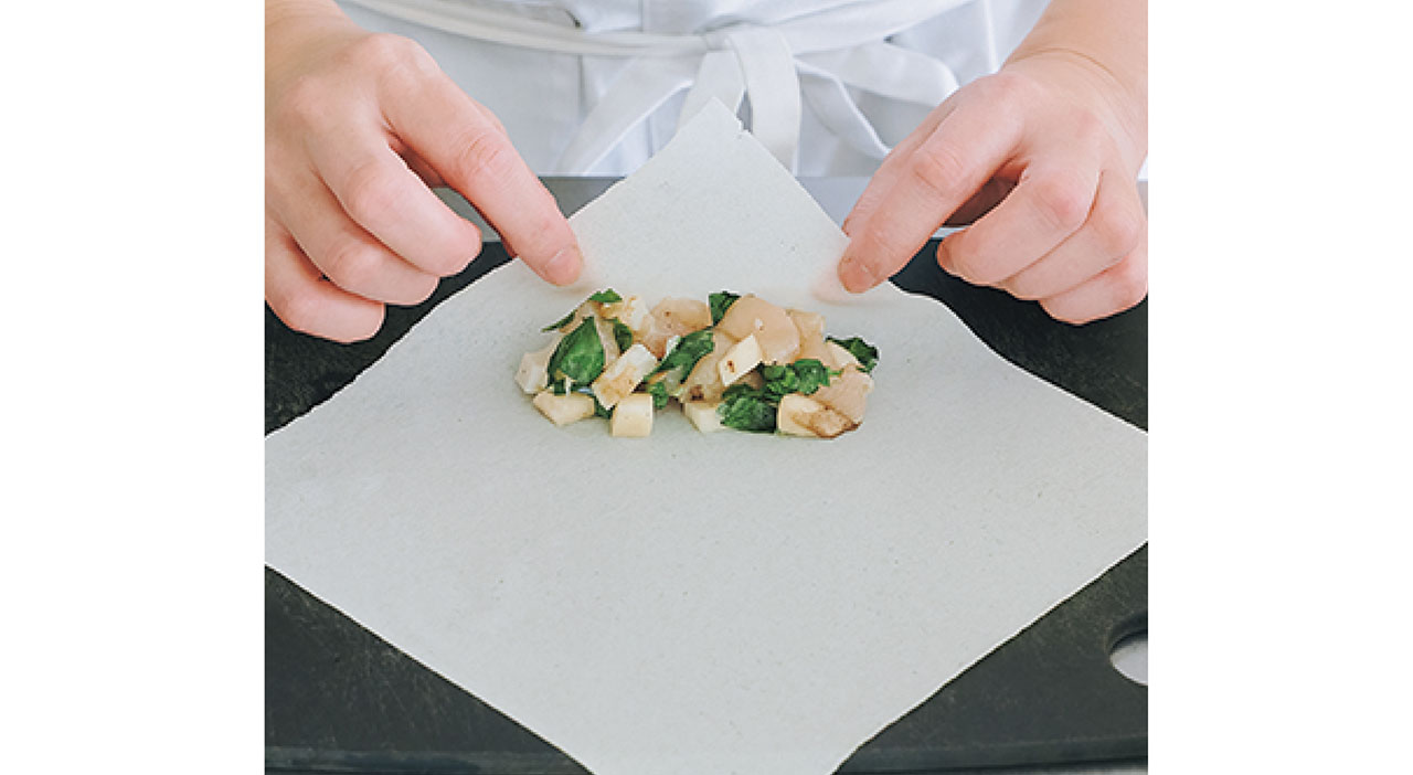 - くるくると巻き上げ、皮の端に水をつけて留める。これを具材と考え、〈基本の巻き方〉でさらに巻く。