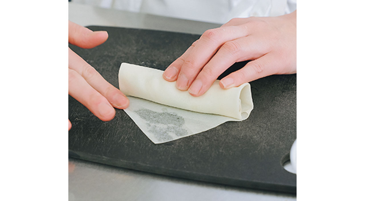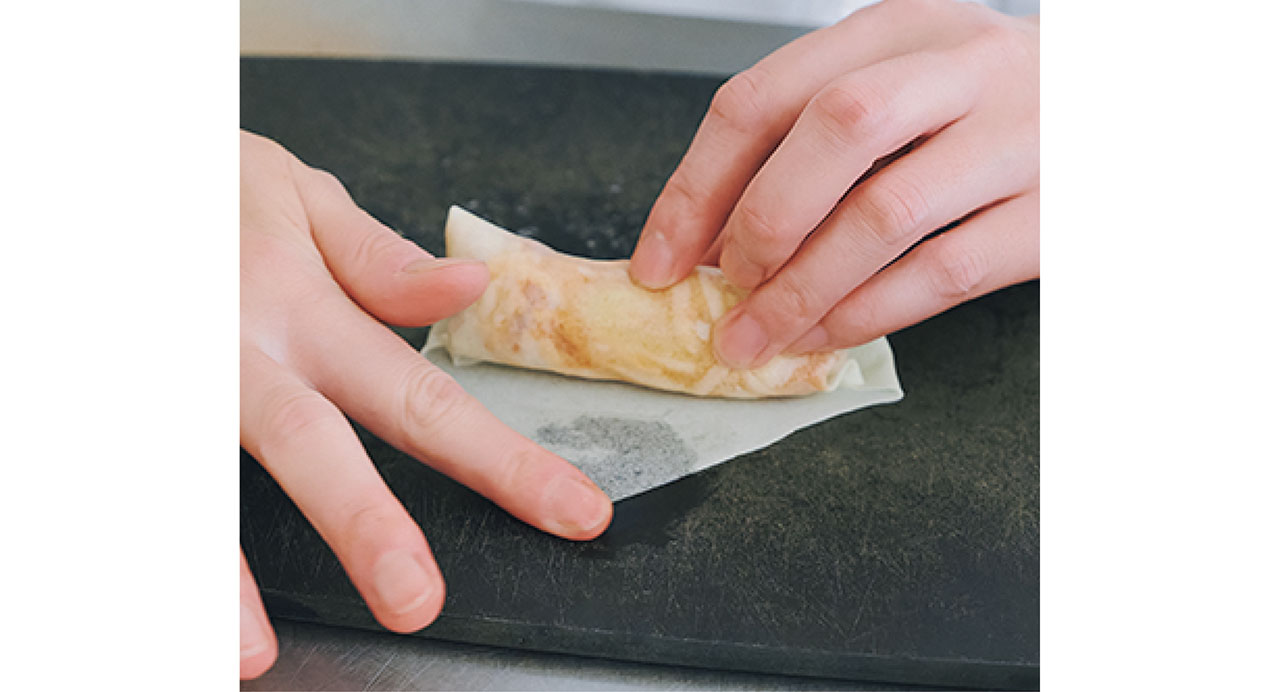 - 具材すべてをおおうように一巻き。ここで、余分な空気が入らないように、具材の下に皮を少しだけキュッと入れ込むのがきれいに巻くコツ。