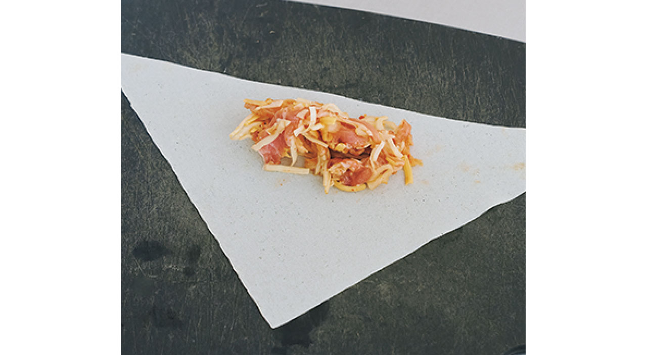 - 斜め半分に切った皮の手前側に具材をのせる。