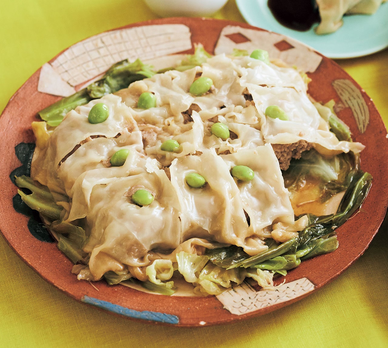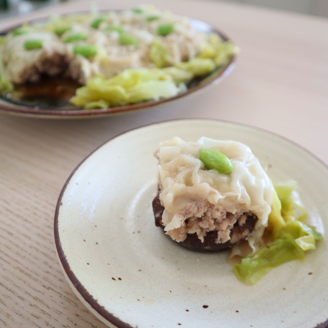 - 直径26㎝のフライパンにフライパンシートを敷き、②のトレーを逆さまにして入れる(しいたけが下になる)。シュウマイの皮をのせて表面をおおい、枝豆を等間隔で並べる。周りにキャベツをちぎりながら入れる。