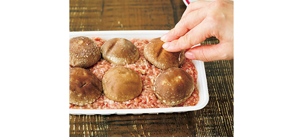 肉ダネはトレーでこね、具材のしいたけは刻まず丸ごとのせる。手間なしなうえ、肉のうま味をしっかり吸ってくれる