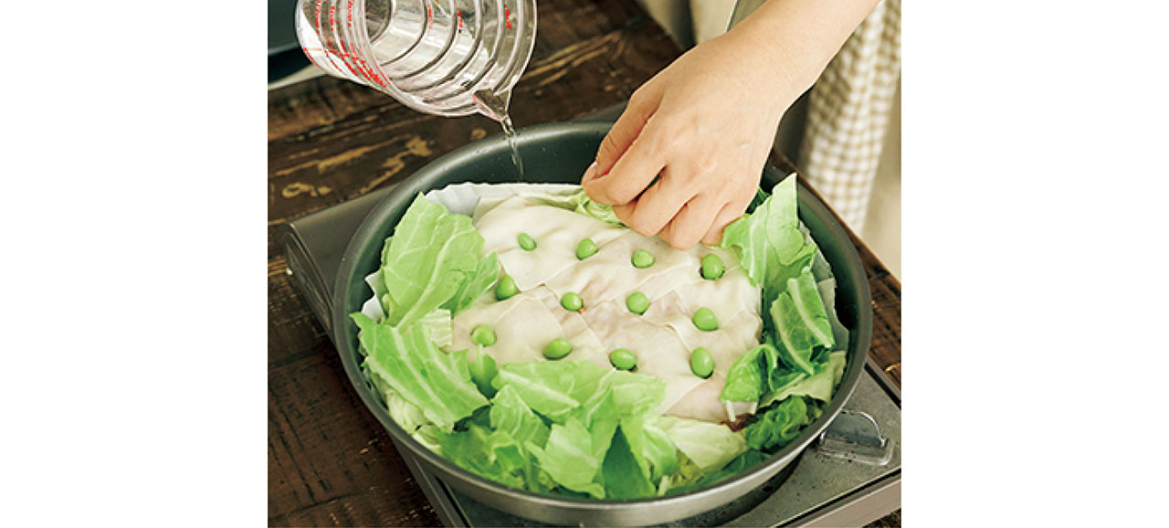紙ワザ使いで、フライパン蒸し物。シートの外側に水を注いでフタをすればOK。キャベツも一緒に蒸せば、副菜感覚に!