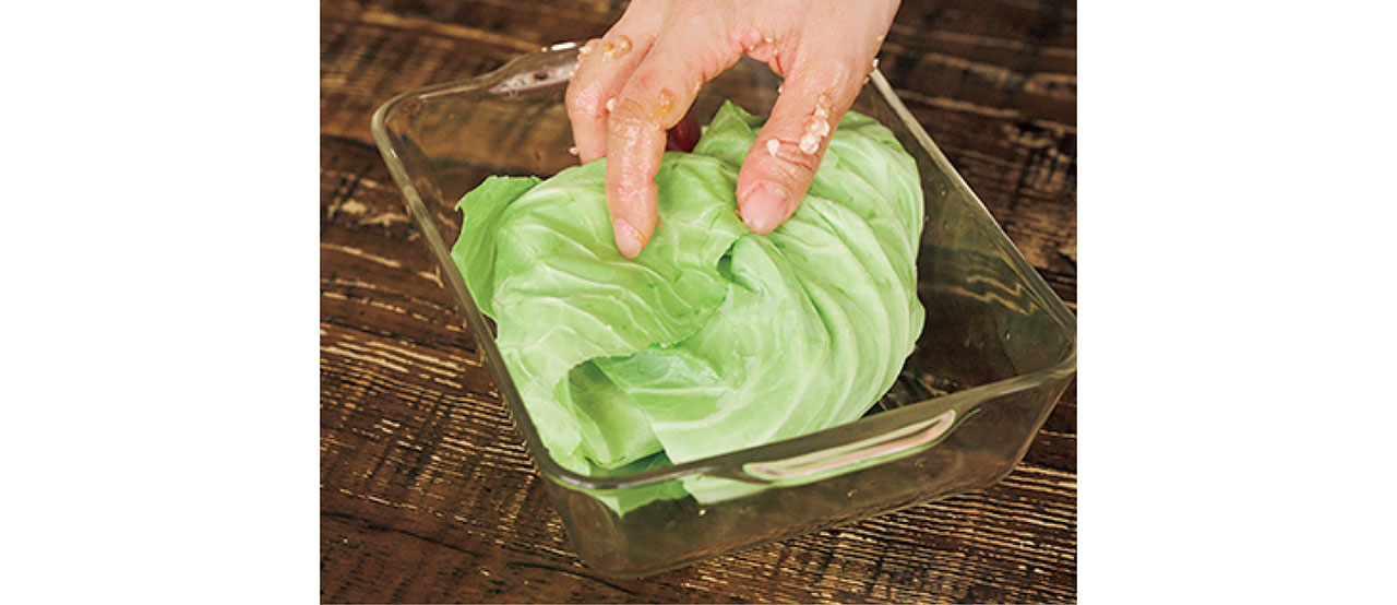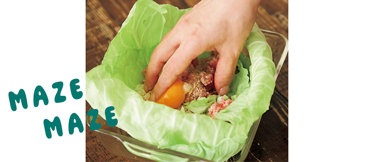 - ①で切り取ったキャベツの軸をひき肉の上にキッチンバサミで細かく切って加える。全体をこね、キャベツで包む。